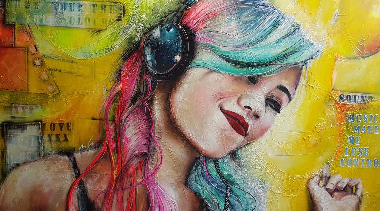 Een globale impressie van het schilderij "Music makes me lose Control" 225x125cm.