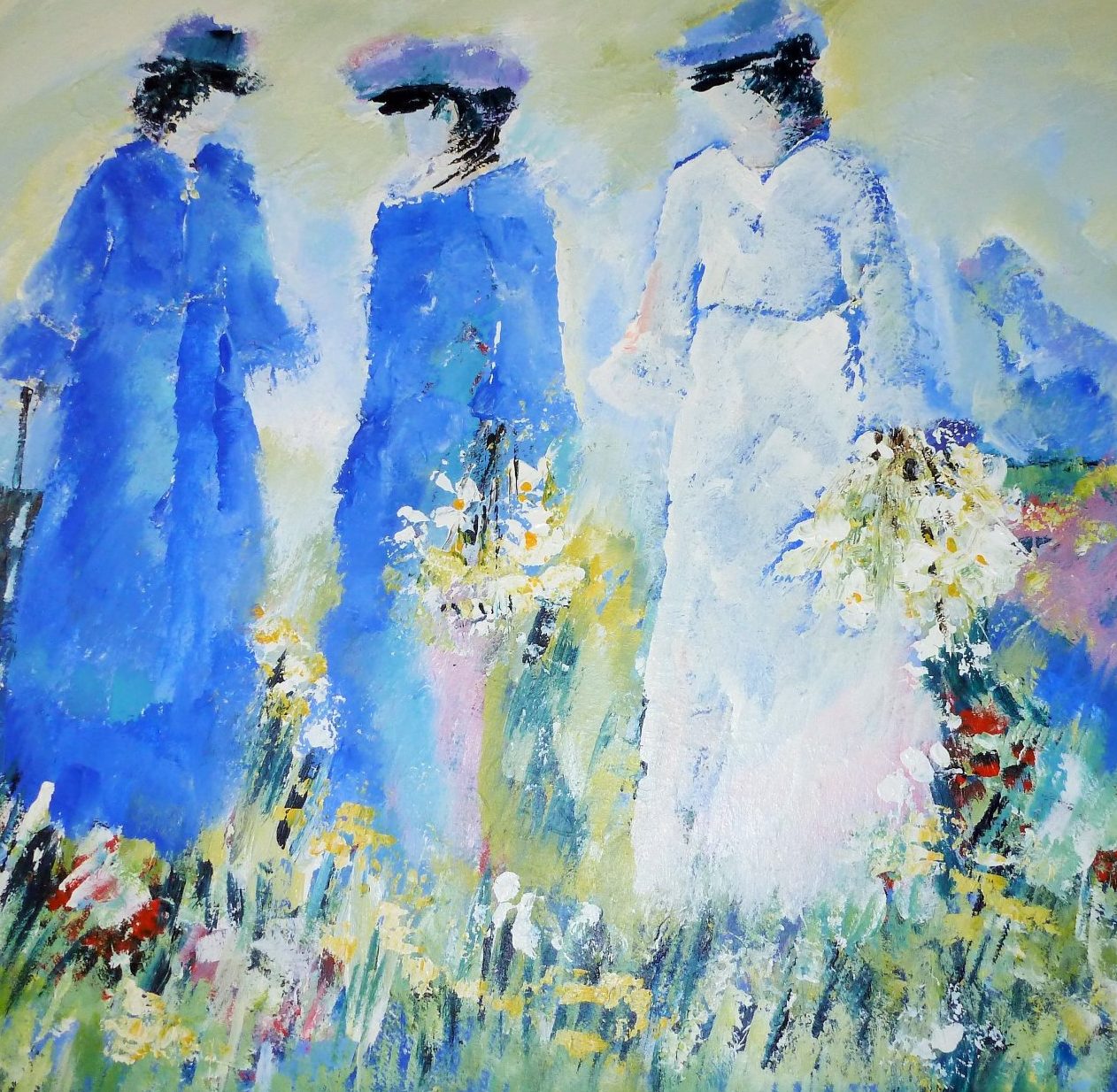 Een globale impressie van het schilderij "Naar het feest" 100x100cm.
