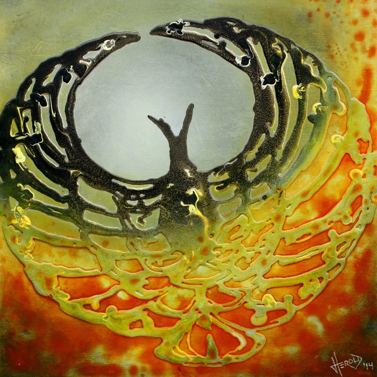 Een globale impressie van het schilderij "Bird of Feather" 40x40cm.