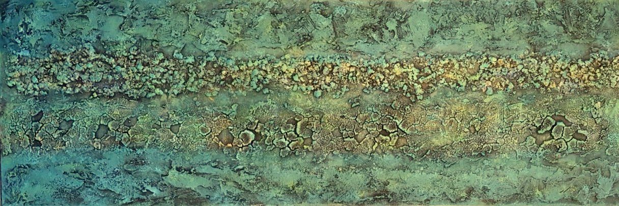 Een globale impressie van het schilderij "Falling in pieces II" 150x50cm.