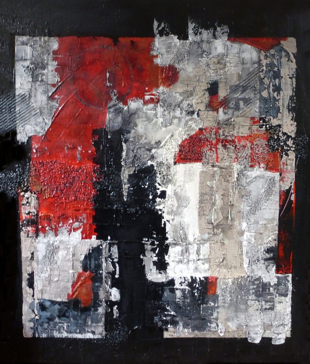 Red Fantasy, een goed opgewerkt doek, kleuren rood, zwart, wit en oud rose,