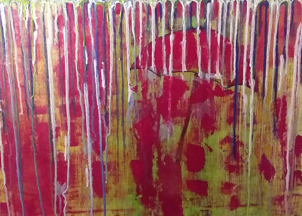 Acryl werk verliefd stel schuilen onder de paraplu voor de sneeuwstorm