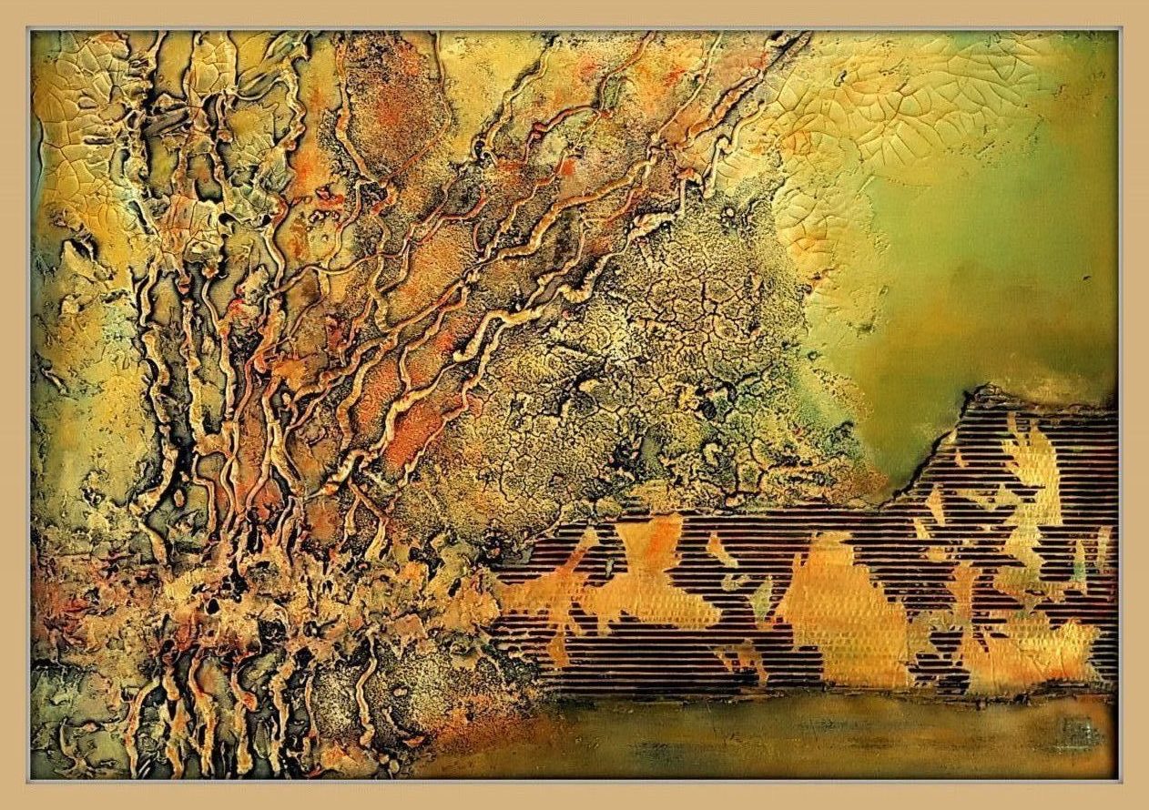 Materieschilderij met veel textuur in warme kleuren