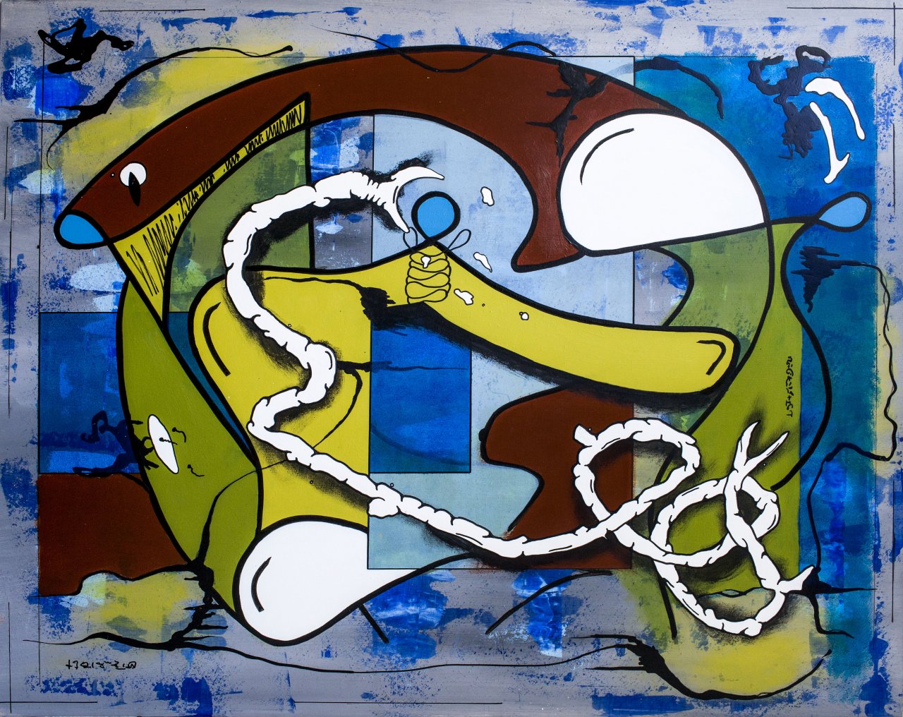 Een globale impressie van het schilderij "I will share it with you, provided you are careful with it" 120x100cm.