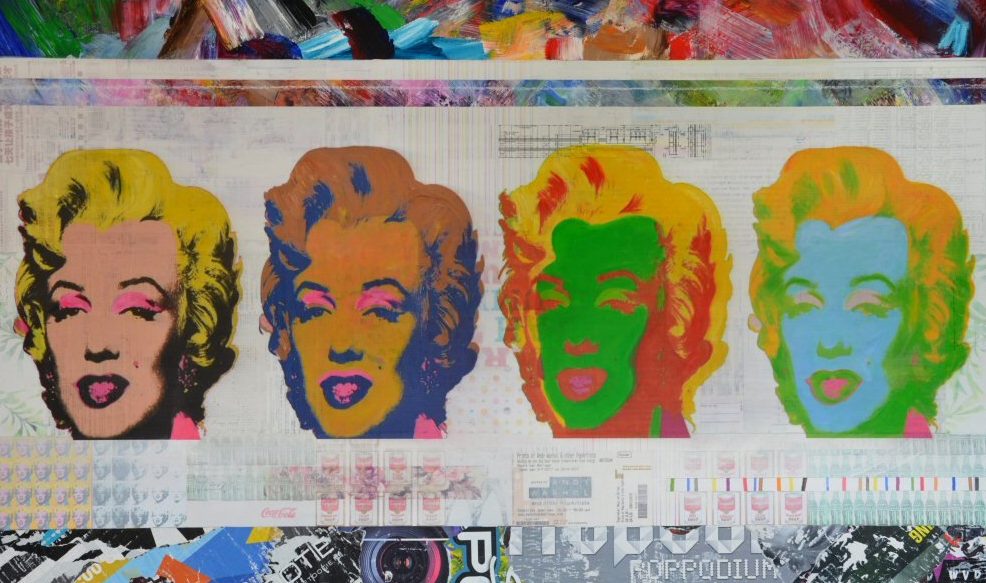 Kleurrijk abstract mixed media schilderij, opgebouwd uit diverse lagen (dekkend en transparant) en met verschillende materialen.