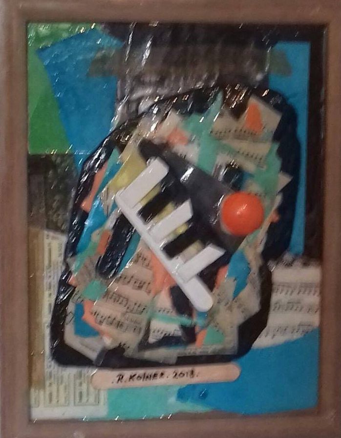 Collage gemaakt op dunne leisteen gemonteerd in lijst zonder glas afgelakt met epoxyhars
