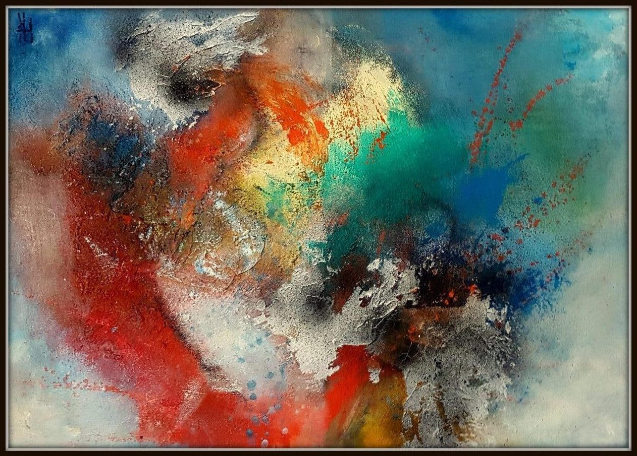 Materieschilderij met veel kleur en textuur, incl. zwarte baklijst