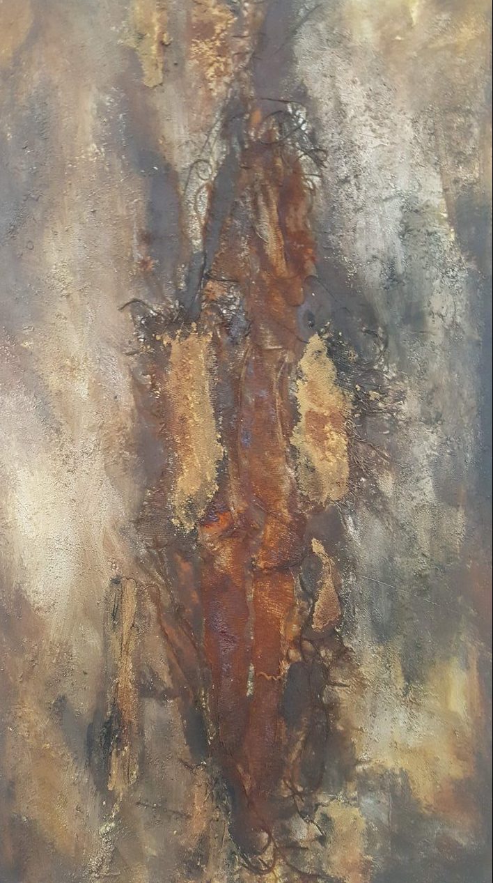 Prachtig mixedmedia schilderij.Aardetinten en echte roest. Dit geeft een hele natuurlijke uitstraling. Warm en spannend.