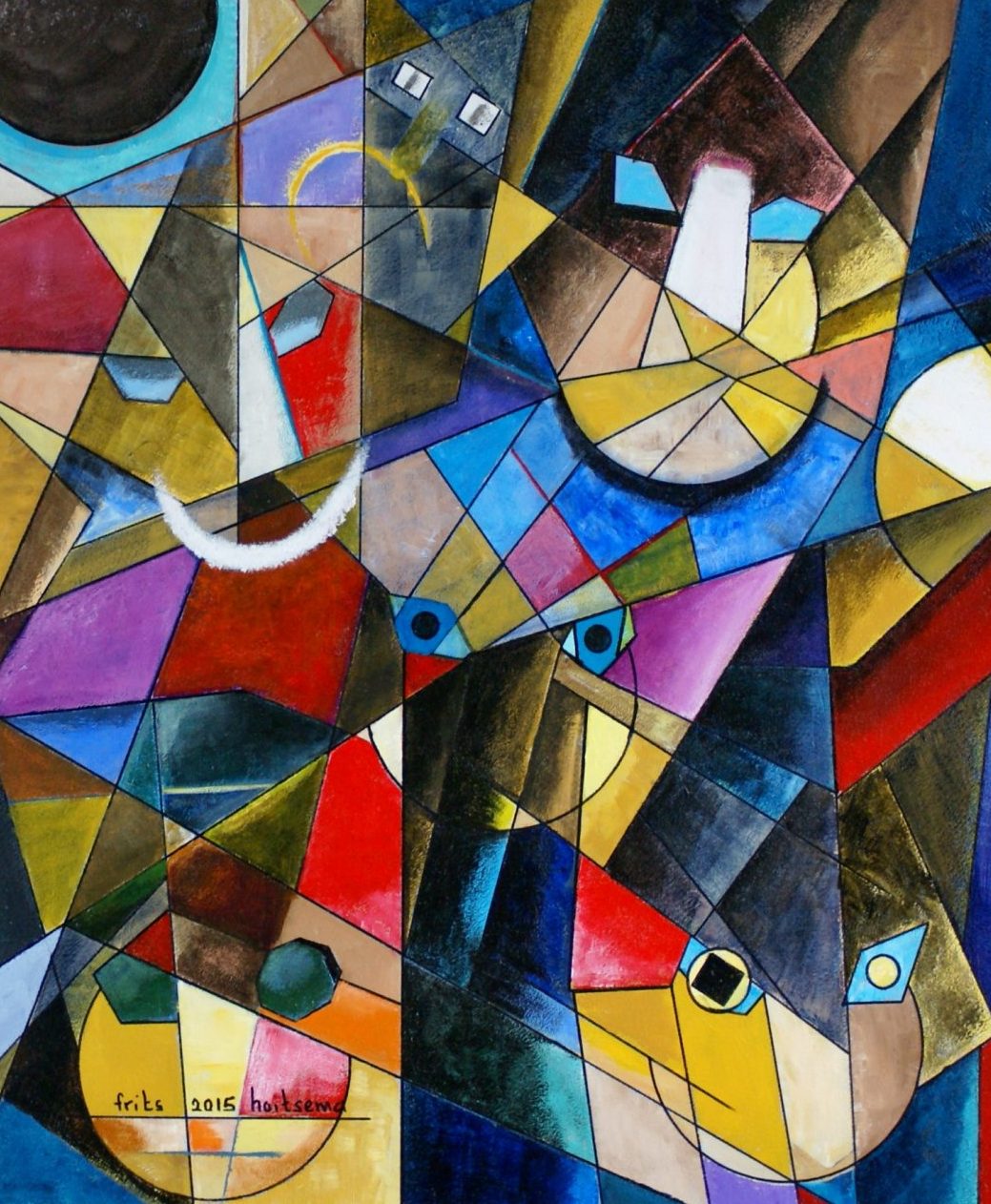 Een globale impressie van het schilderij "7 kattenlevens" 50x60cm.