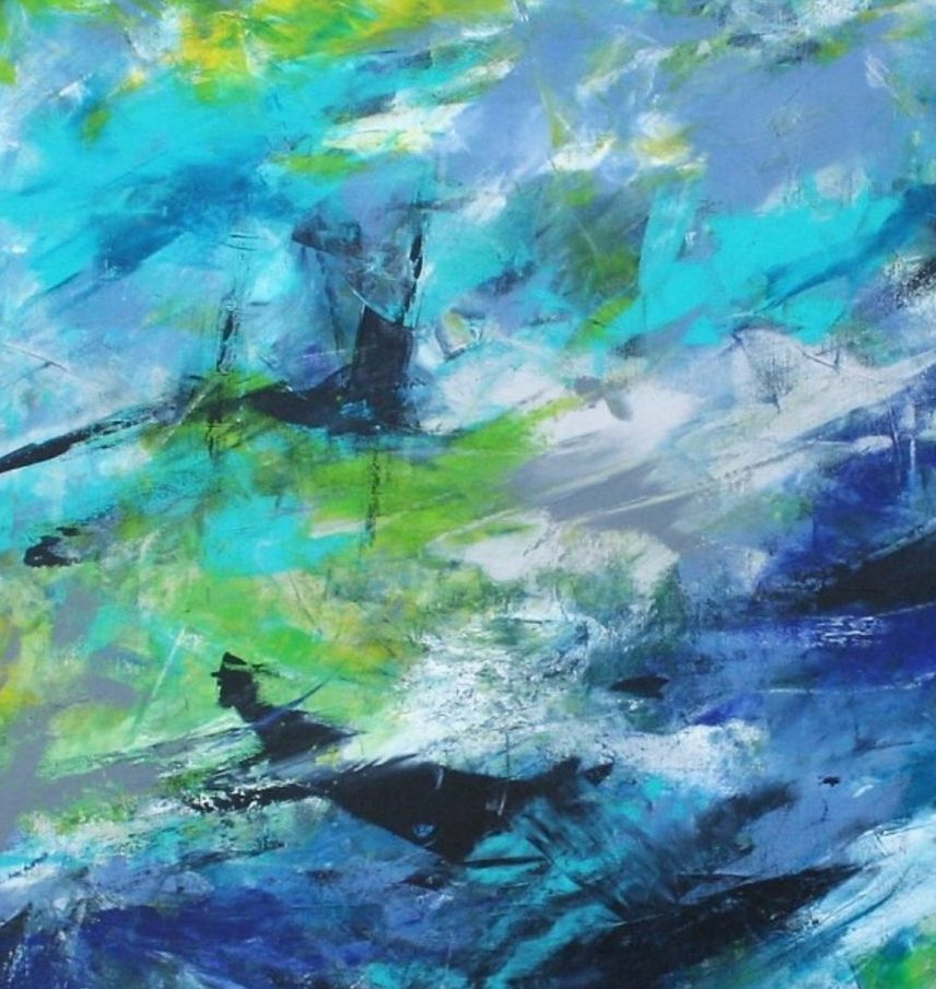 Een globale impressie van het schilderij "Waar vlieg ik 2" 60x60cm.