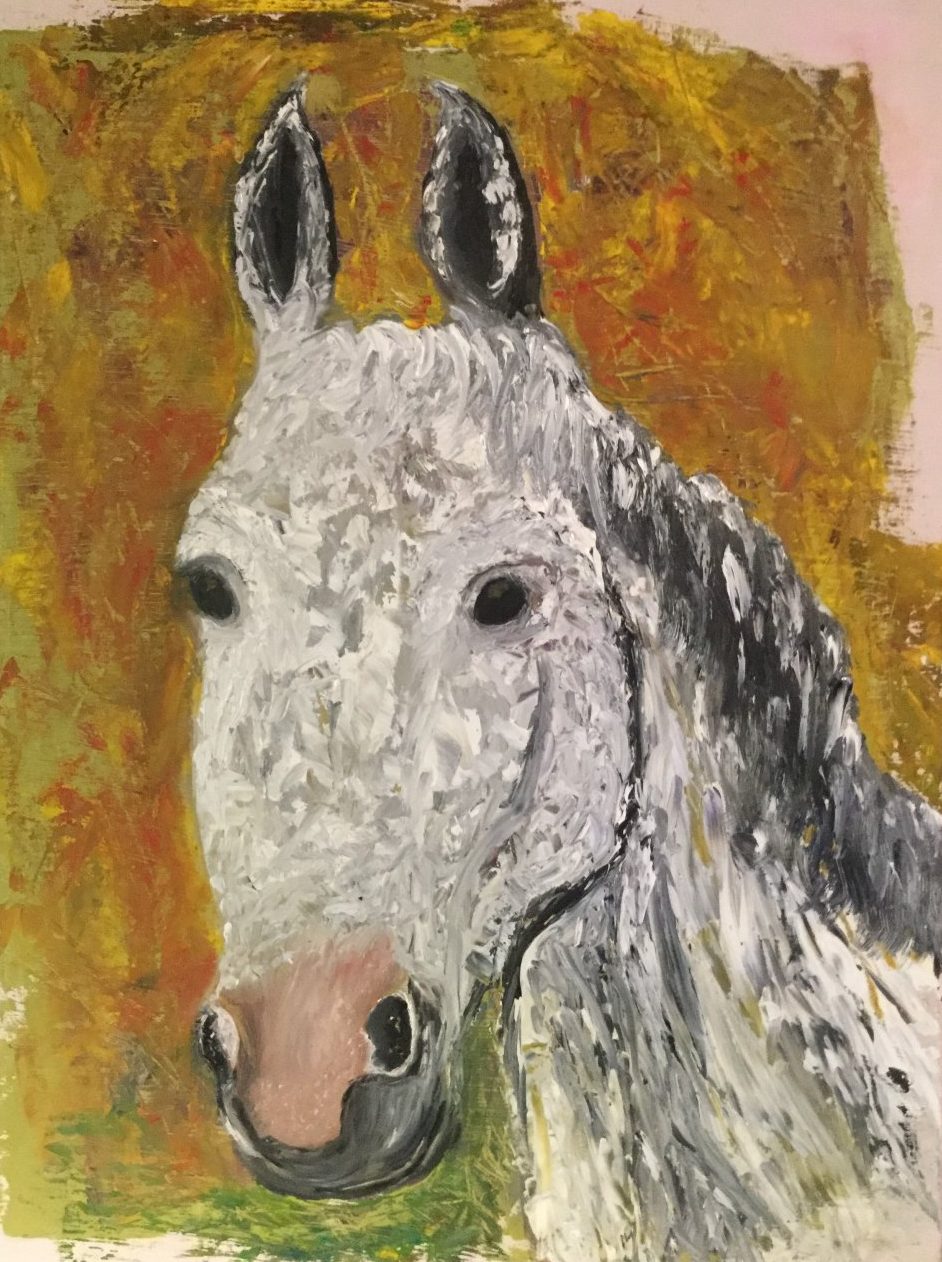 Een globale impressie van het schilderij "Paerd olieschilderij met paletmes" 50x60cm.