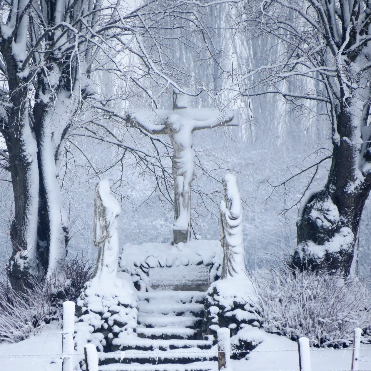 Besneeuwde kalvarieberg olieverfschilderij