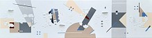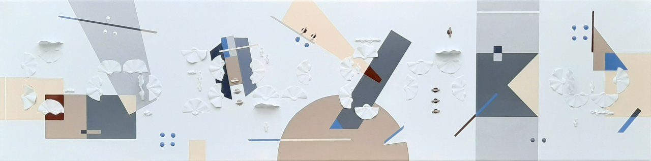 Abstract geometric constructivism. Speelse assemblage met wood flakes, rope, acryl en vernis. 3D en mixed media art. Zonder lijst op formaat 100x30x8cm