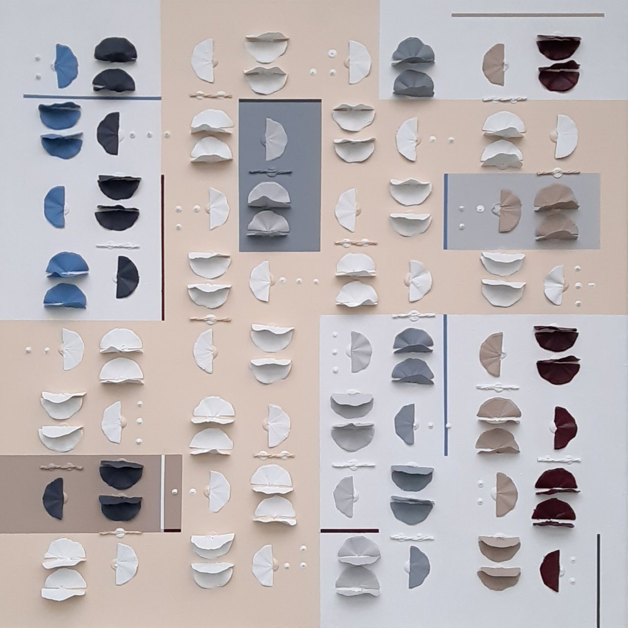 Abstract geometric constructivism. Warme tinten met wood flakes, rope, acryl en vernis. 3D en mixed media art. Zonder lijst op formaat 70x70x8cm. Kan eventueel geleverd met baklijst. Kom gerust even kijken eerst in Waddinxveen.