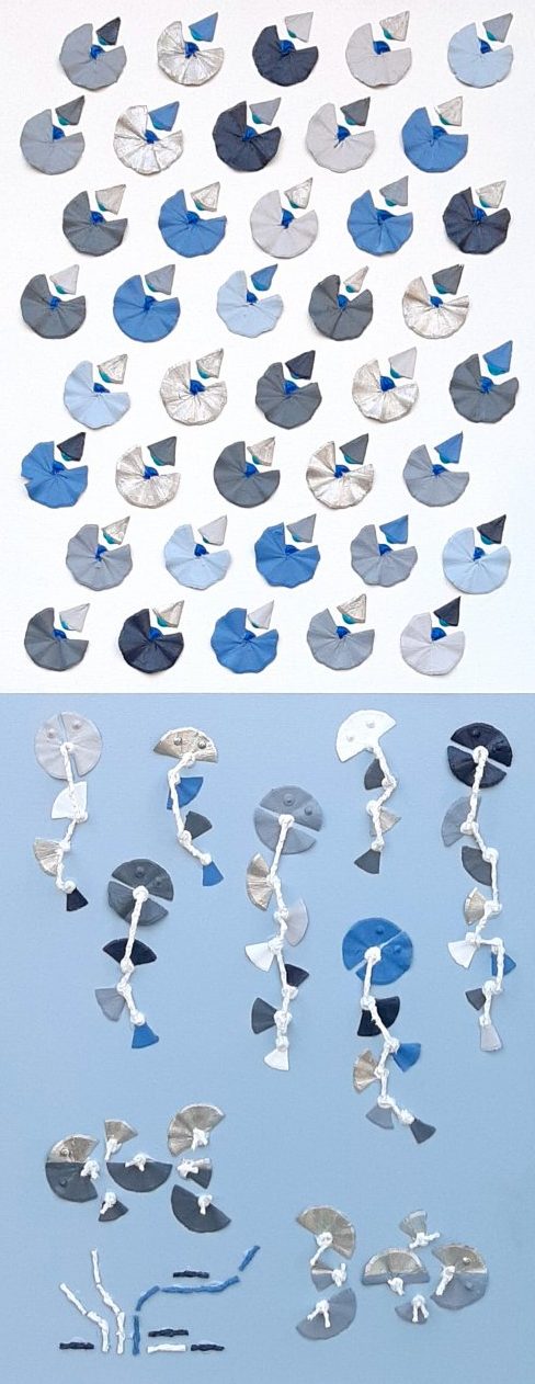 Abstract geometric constructivism as an artwork. Fris en kleurrijk met wood flakes, rope, acryl en vernis. 3D en mixed media art. Zonder lijst op formaat 40x100x8cm. Kom gerust even kijken eerst in Waddinxveen. PS: als je (een soort) regendruppels ziet en een oceaanoppervlak met leven erin, vind ik dat razendknap.
