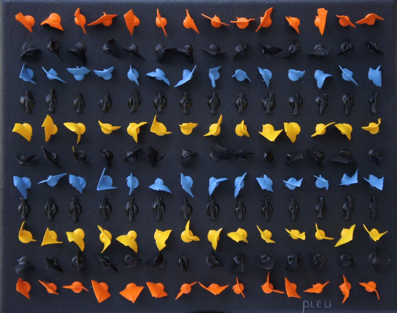 Klein maar fijn en kleurrijk werkstuk: Regatta. 3D artwork. Hemp rope, acryl, wood flakes and varnish. Geometric, abstract, art, constructivism. Formaat 30x24x8cm.