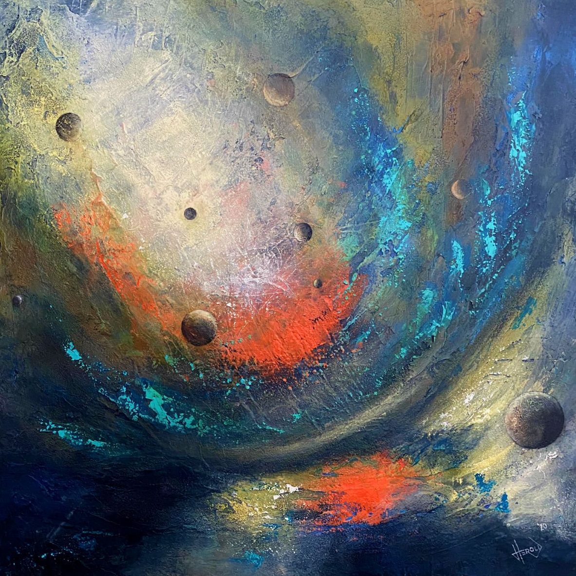 Een globale impressie van het schilderij "New Frontiers" 70x70cm.