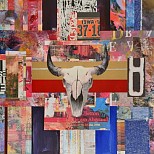 Modern abstract mixed media schilderij opgebouwd uit diverse lagen, dekkend en transparant en met verschillende materialen.