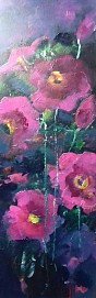 Een globale impressie van het schilderij "Stokrozen" 40x120cm.