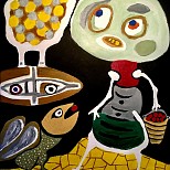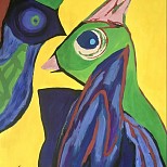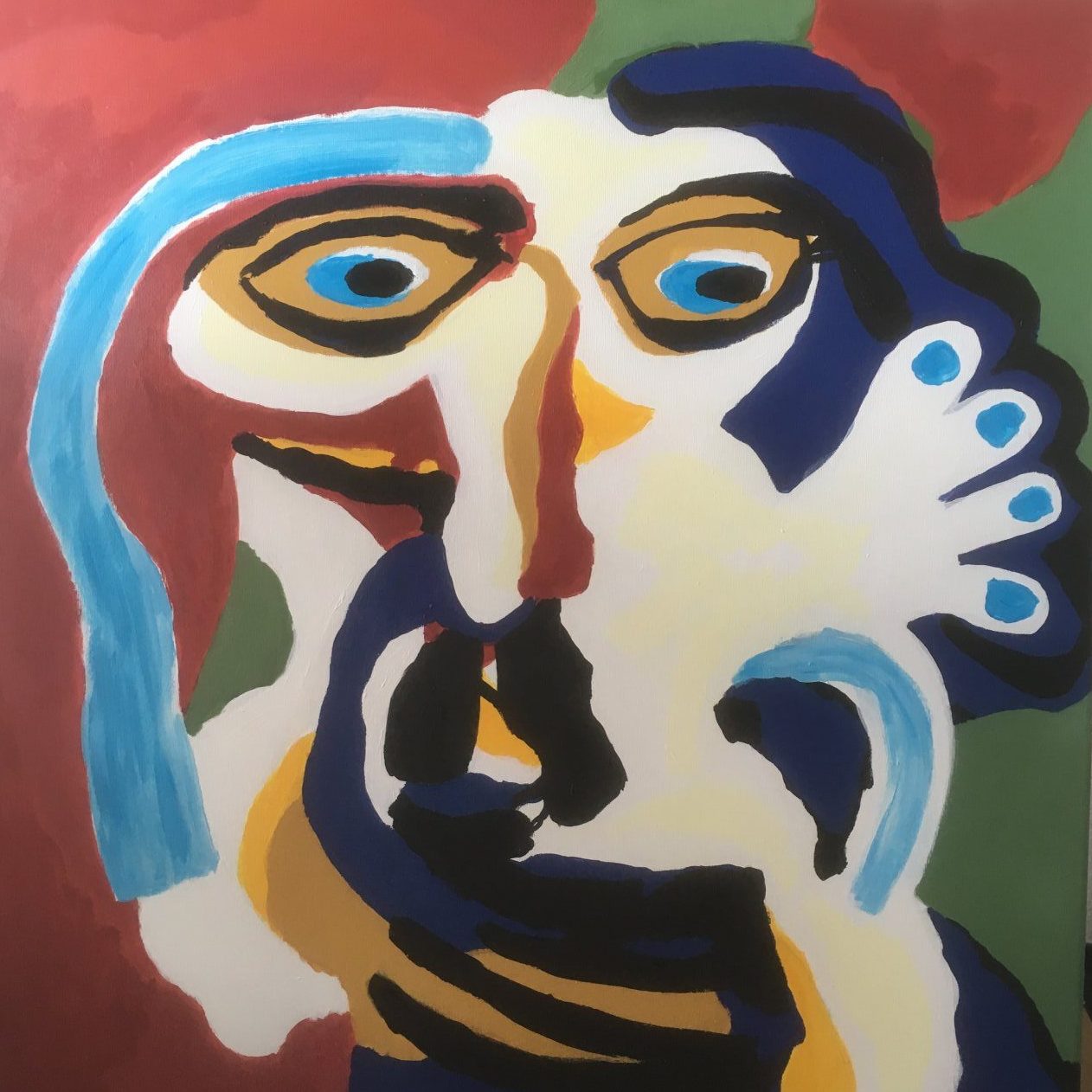 Een replica van het schilderij "kijk mij eens" van Karel Appel. Acryl op Canvas doek met zwarte houten omlijsting. ( Niet zichtbaar is de handtekening van Karel Appel )