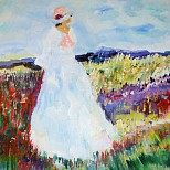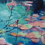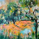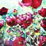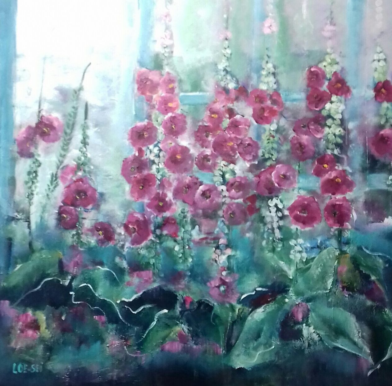 Een globale impressie van het schilderij "Stokrozen" 100x100cm.