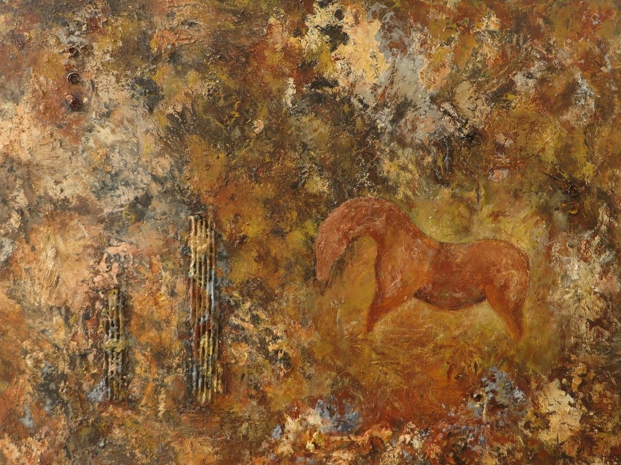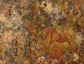Paardje in een abstracte omgeving, geschilderd op doek. Inspiratiebron: een klein beeldje uit de prehistorie. Acryl, mixed media, structuur.