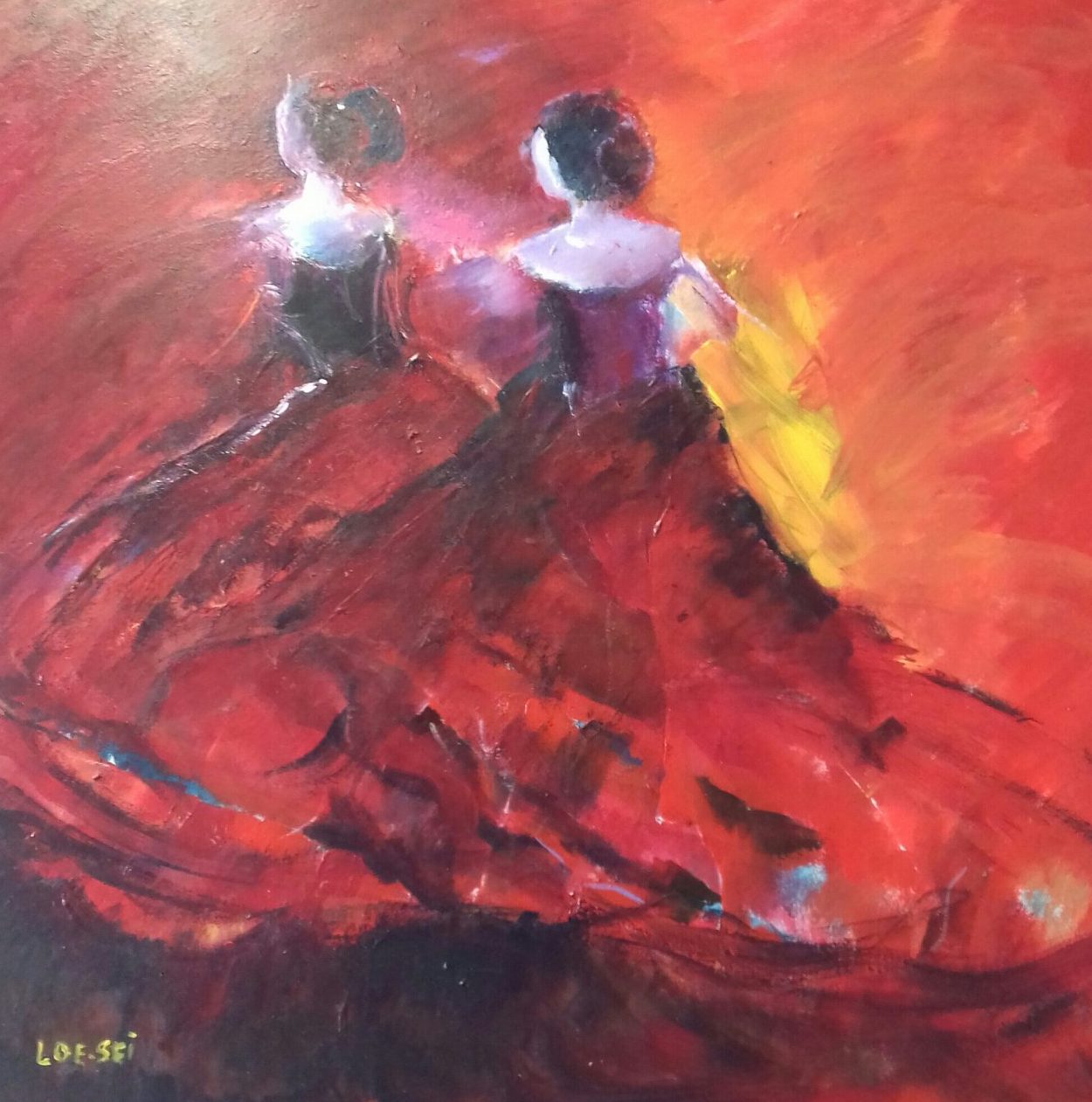 Een globale impressie van het schilderij "Rode dans" 100x100cm.