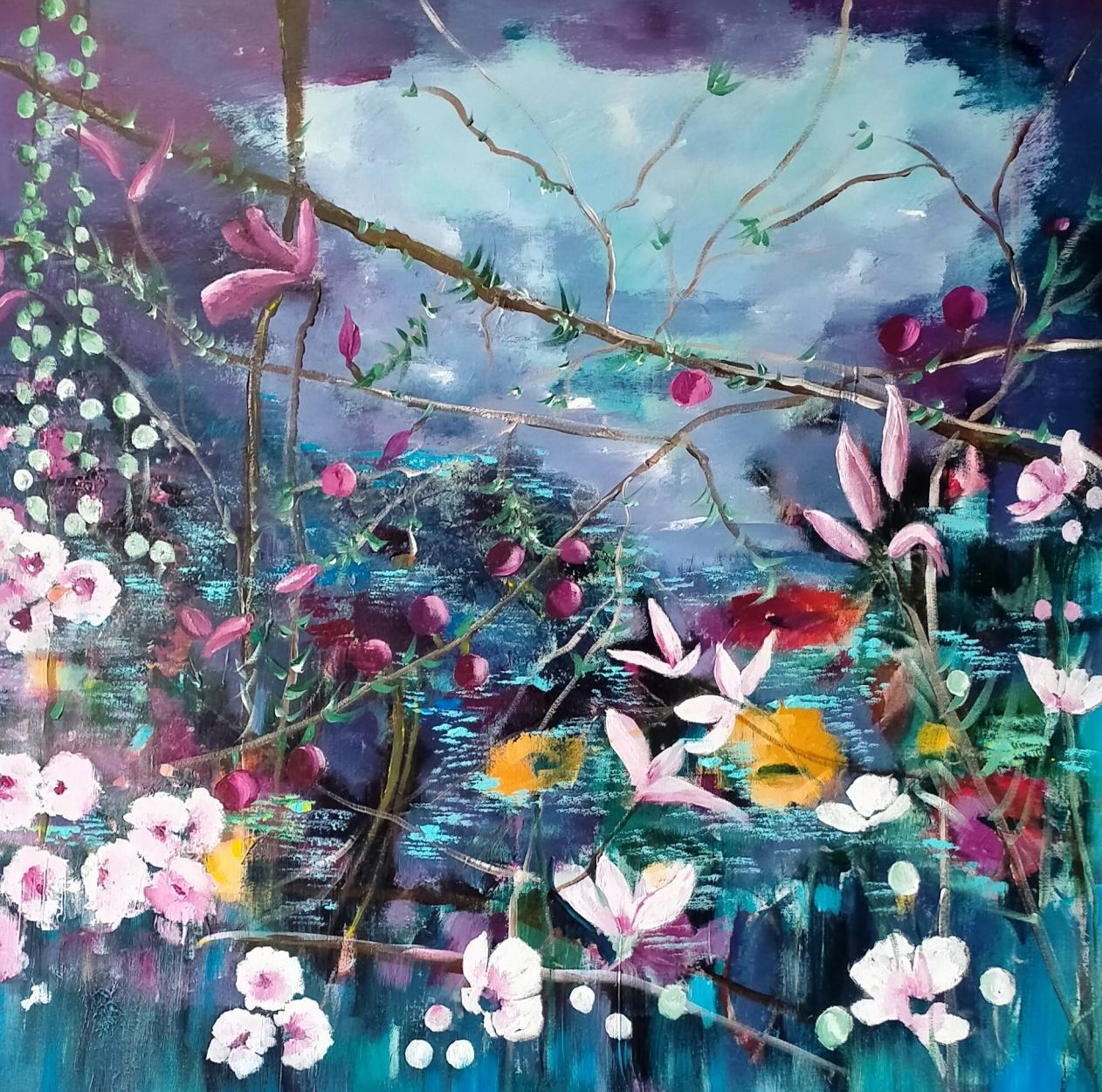 Een globale impressie van het schilderij "Tuin" 100x100cm.