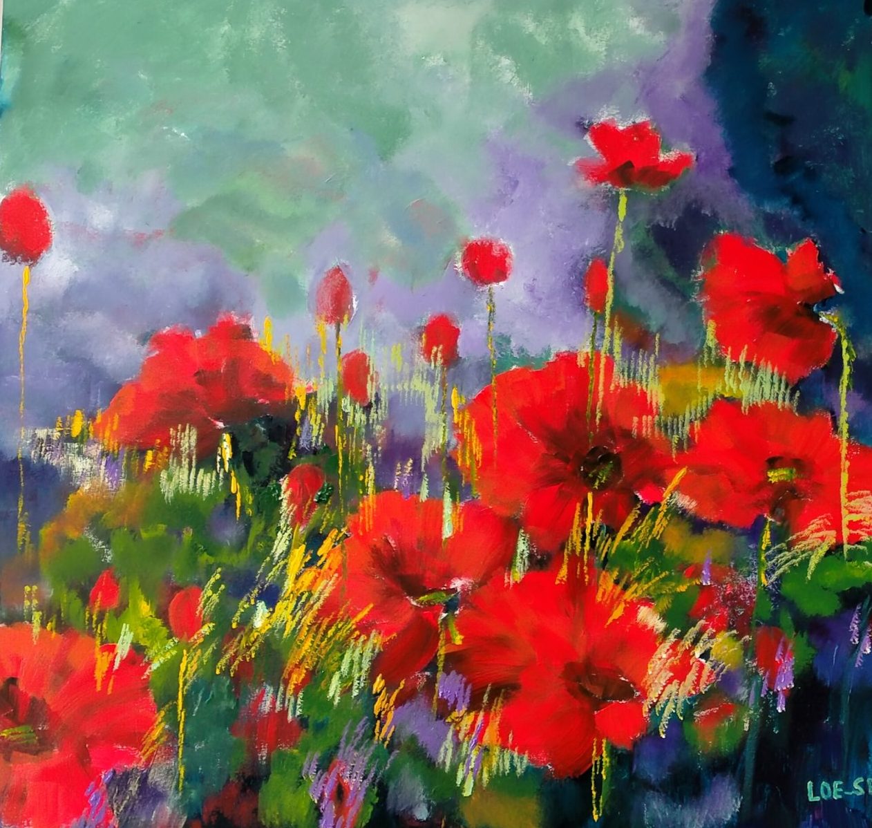Een globale impressie van het schilderij "Klaprozen" 100x100cm.
