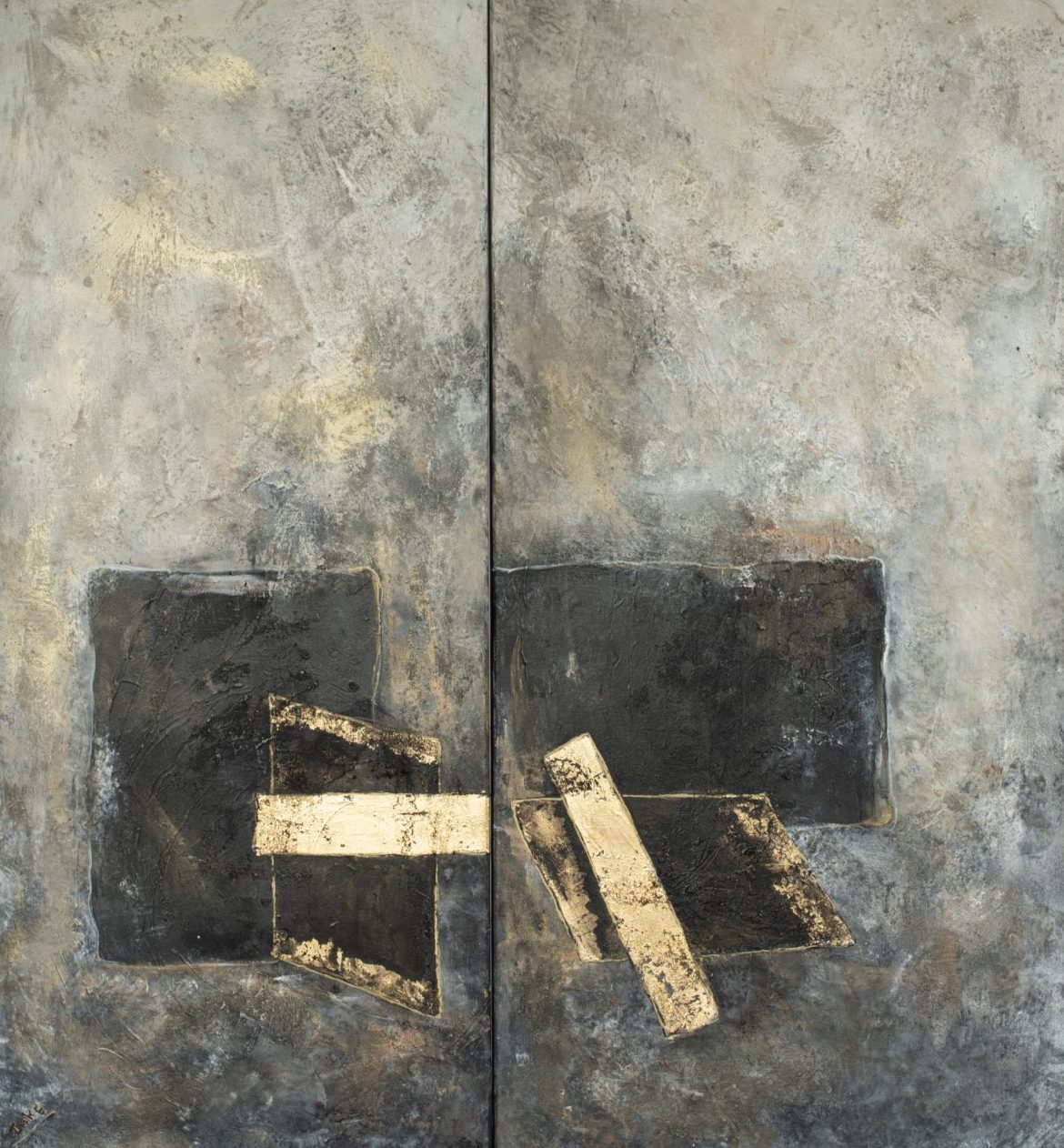 Abstract schilderij think gold 2 Luik 50x 120 + 60x120 geschilderd door Imke de Vries