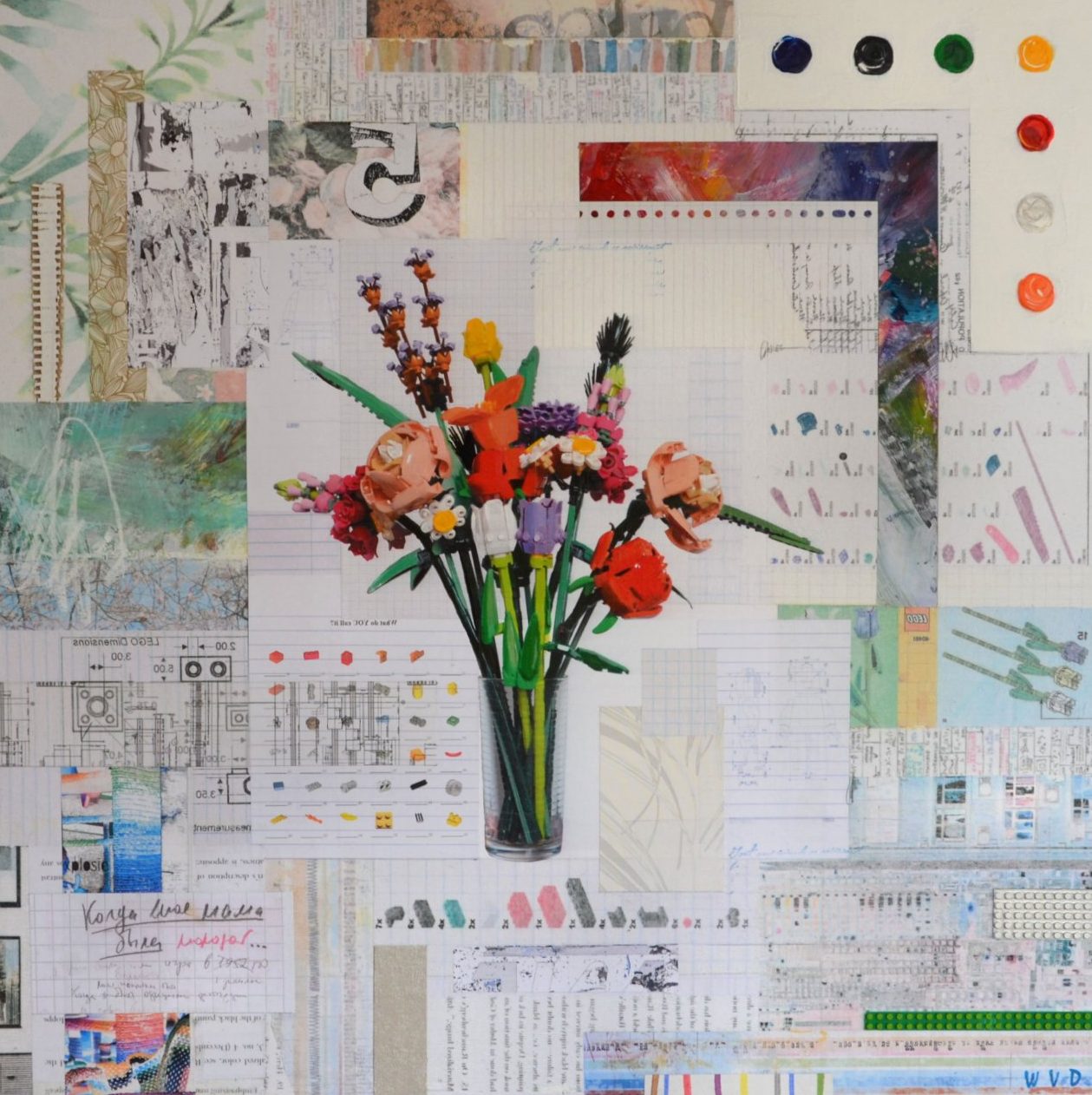 Een globale impressie van het schilderij "Lego Flowers" 90x90cm.