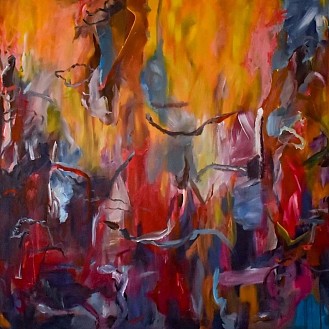 Een globale impressie van het schilderij "Let's go out tonight" 150x150cm.