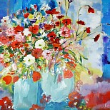 Vaas met klaprozen en tulpen