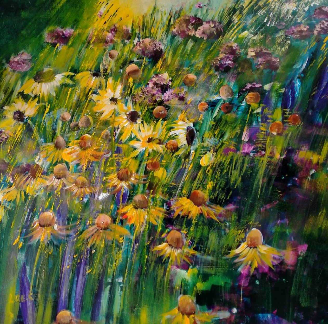 Een globale impressie van het schilderij "Prairietuin" 100x100cm.