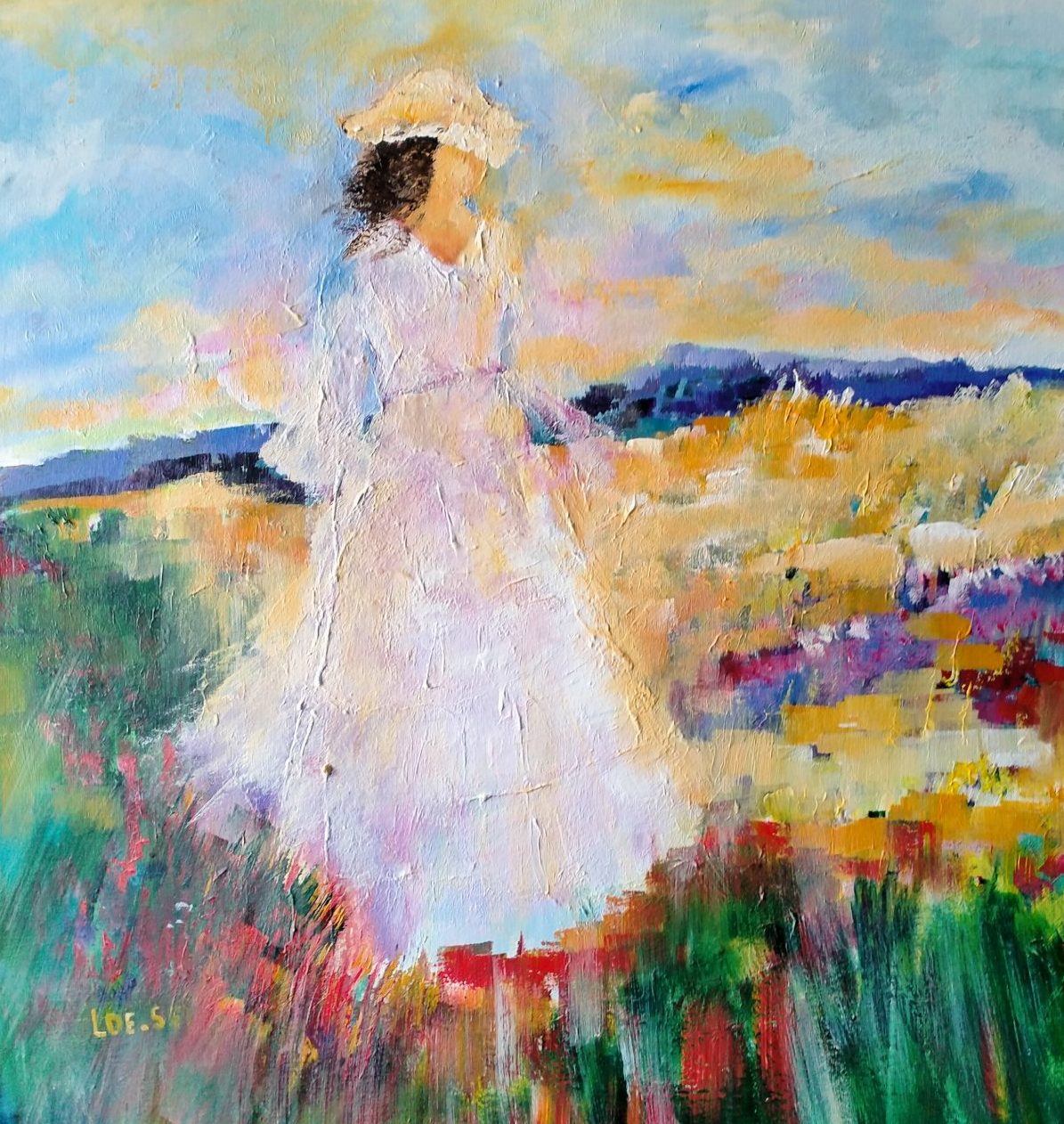 Een globale impressie van het schilderij "Romantisch tafereel" 100x100cm.