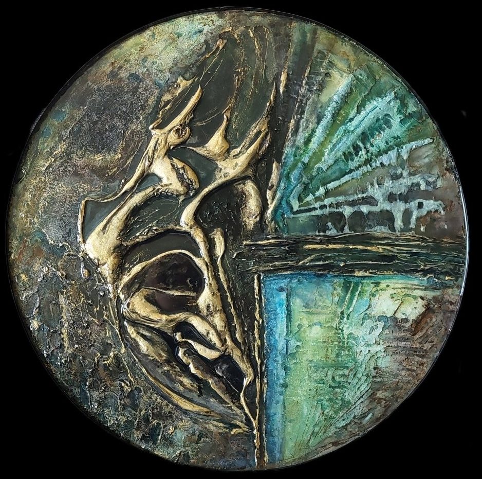 Met structuurpasta, acrylverf, crackle pasta en epoxyhars afgewerkt.