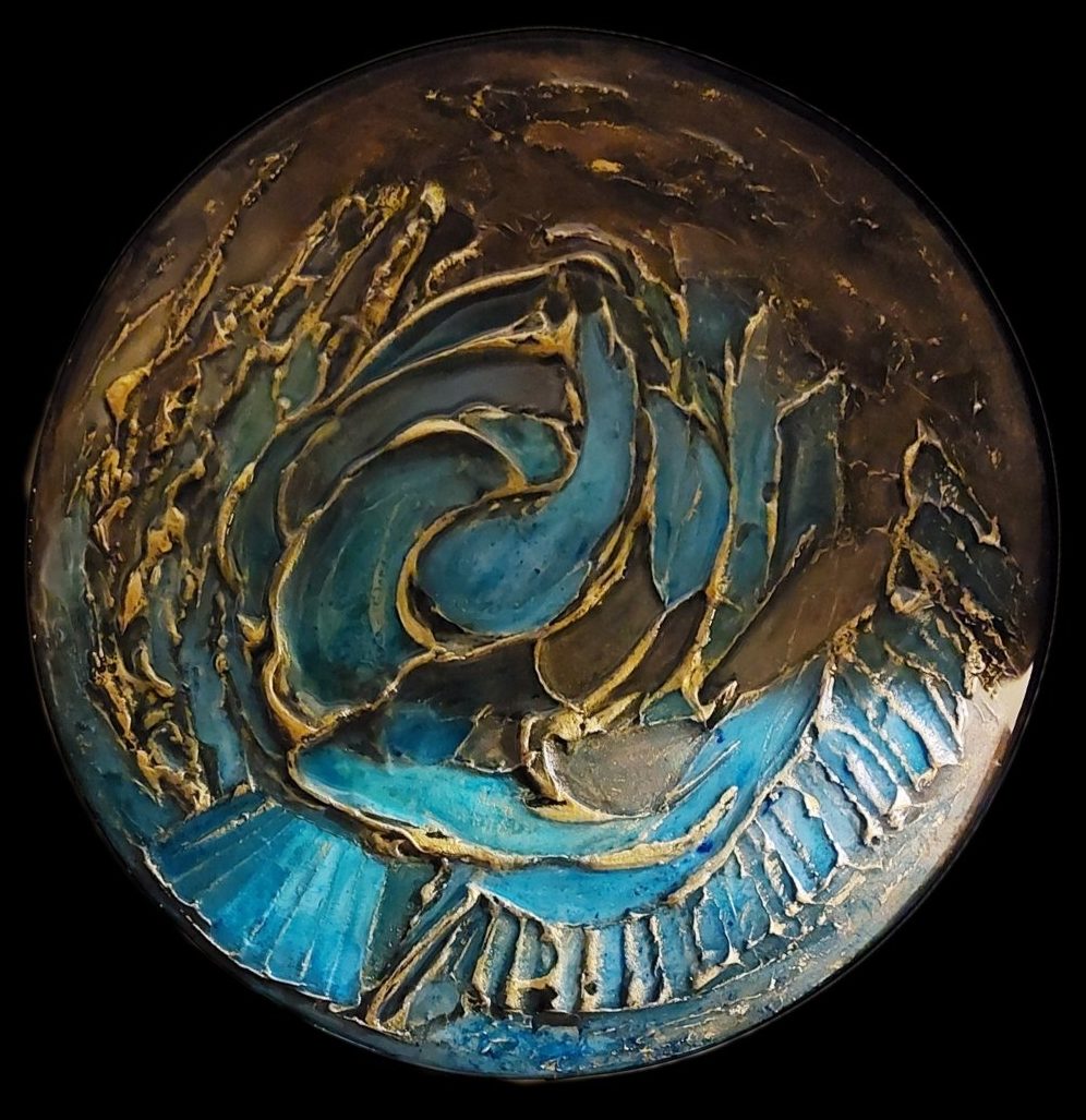 Met structuurpasta, acrylverf en epoxyhars afgewerkt.