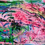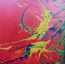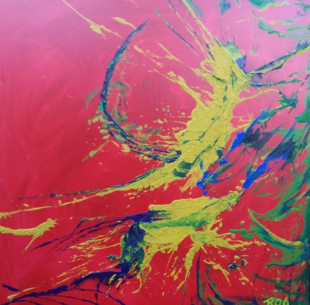 Een globale impressie van het schilderij "Sprinkhanen" 100x100cm.