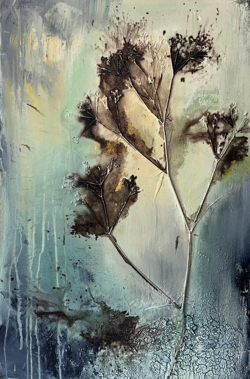 Abstract met mixed media, veel textuur en fluitekruid