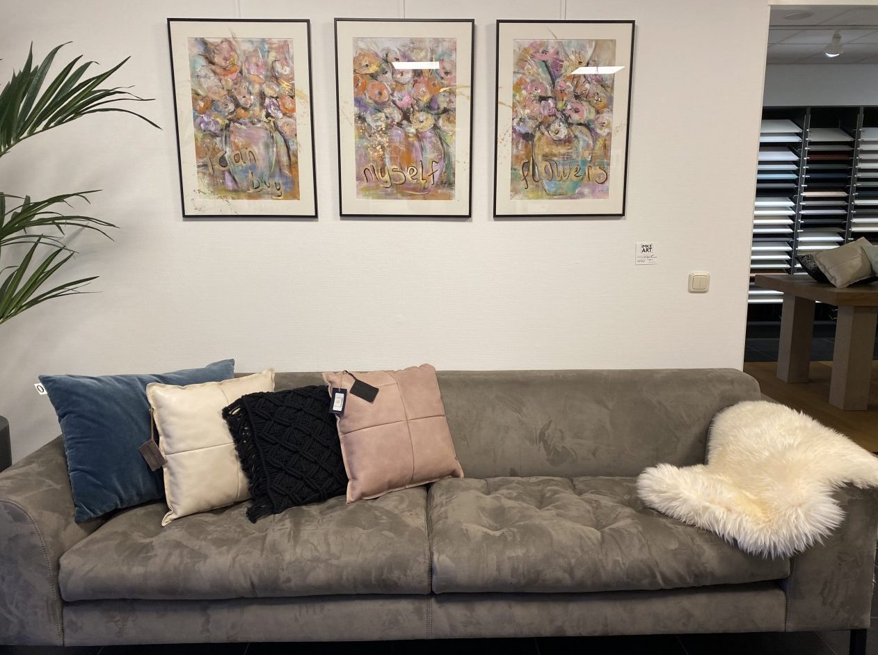 I can buy myself Flowers . 3 Luik . 3 x schilderij 50x 70 met paspartout. Met zwarte lijst en glasraam en ophangsysteem .