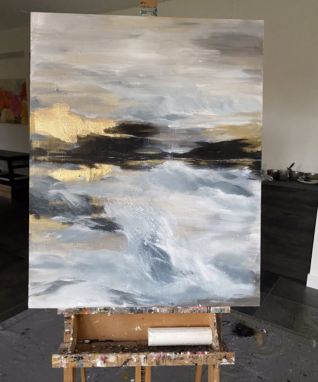 Geïnspireerd door het verblijf op Lanzarote.mixed media . Acryl ,bladgoud op 3D doek.