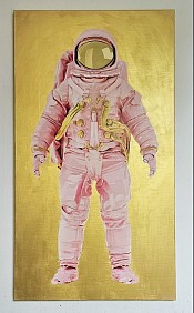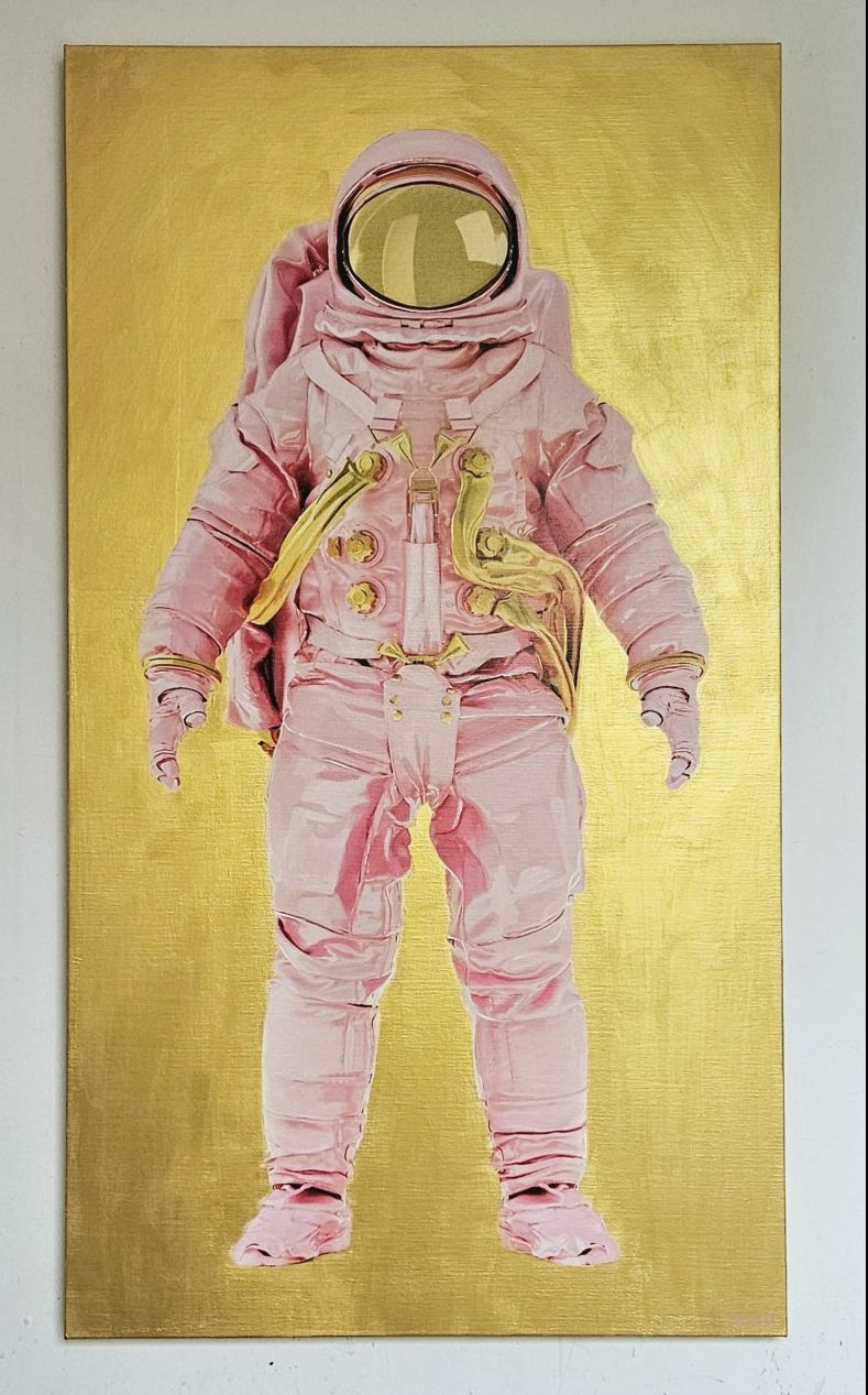 Een globale impressie van het schilderij "Roze Astronaut" 80x150cm.