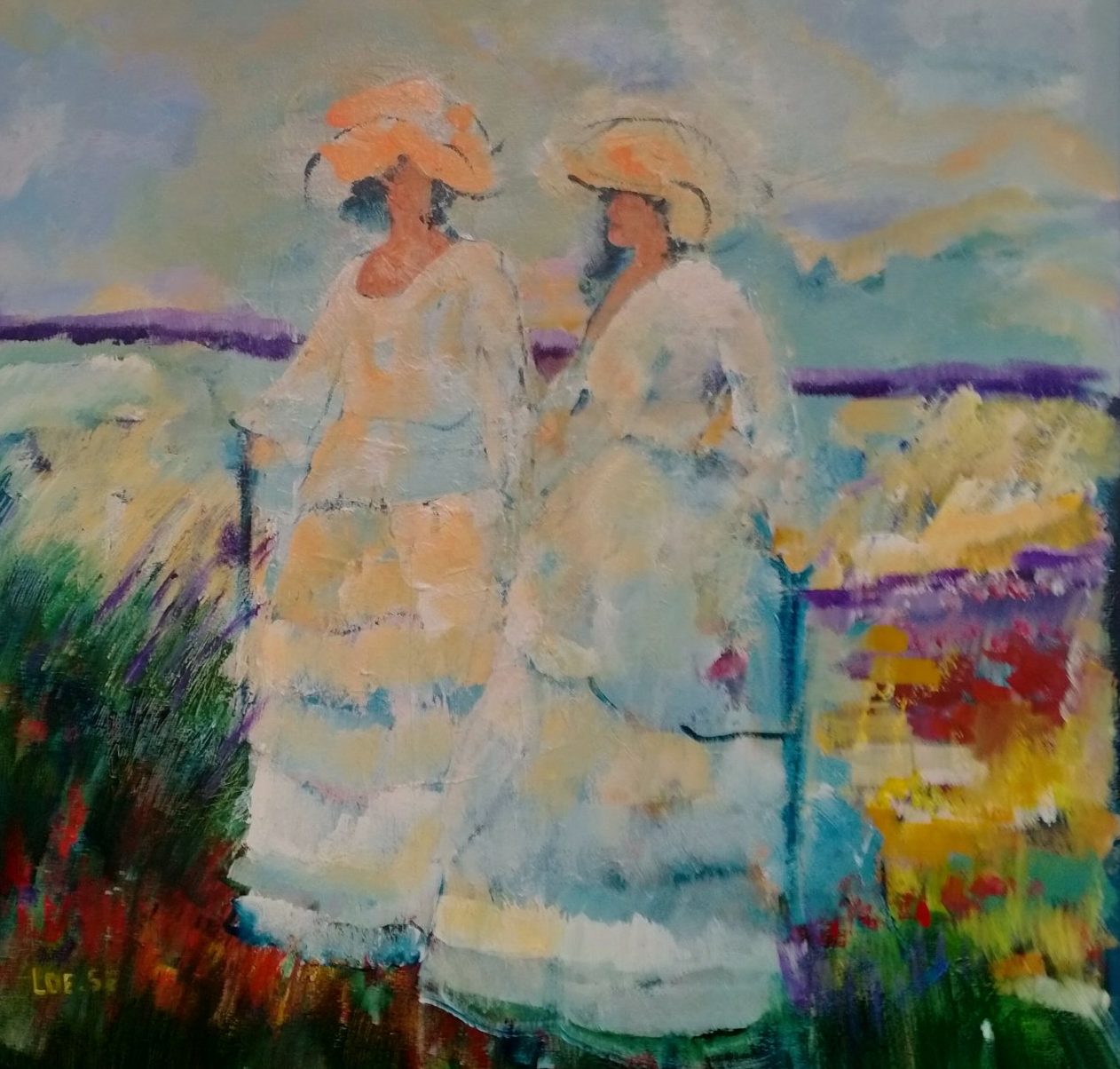 Een globale impressie van het schilderij "Romantisch tafereel" 100x100cm.