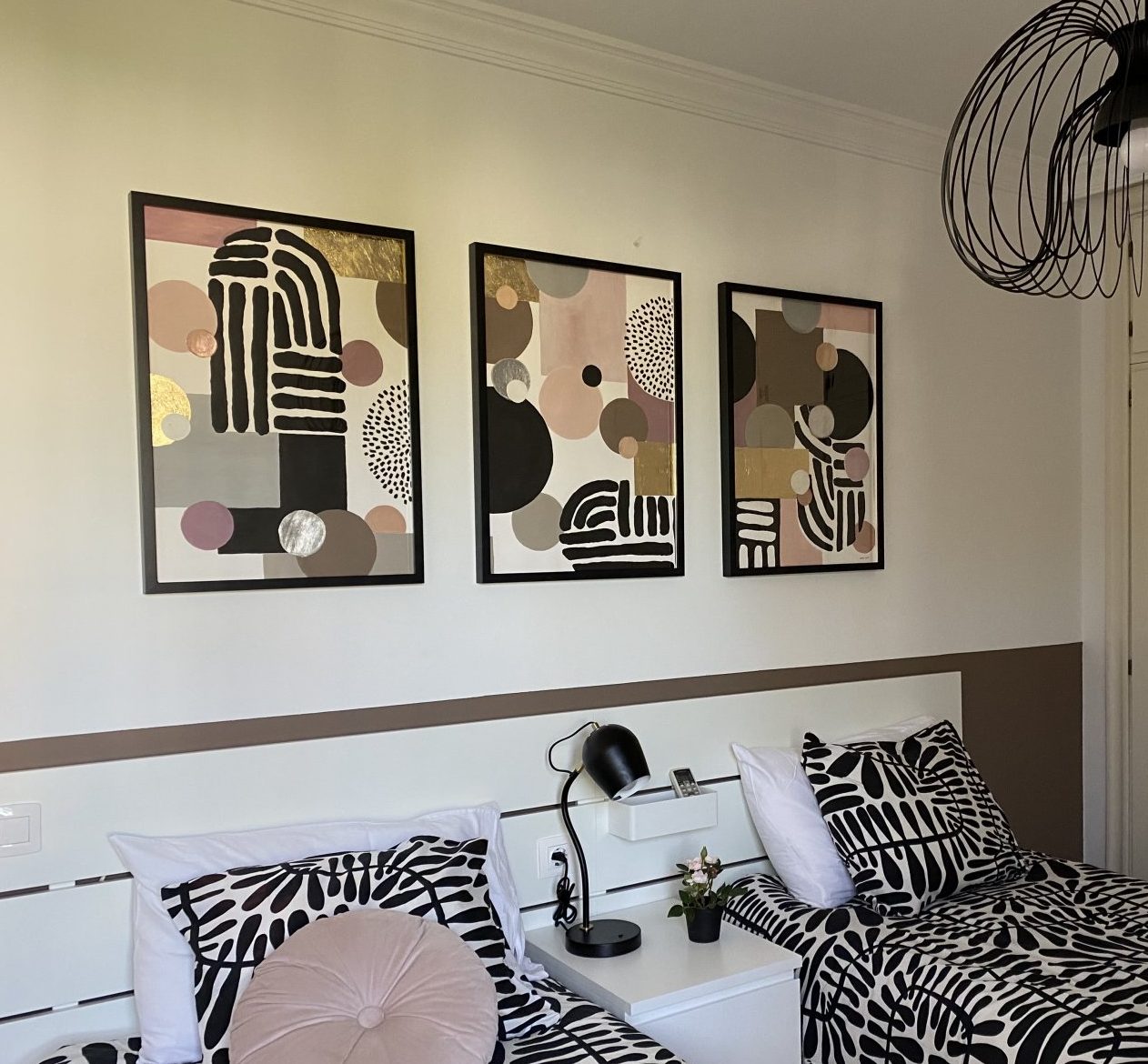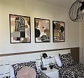 3 Luik.3 x 55x75 cm. Arte 2. Aangepast op de inrichting slaapkamer. Mixed media art. Met goud en zilverblad. Acryl op papier met zwarte lijst.