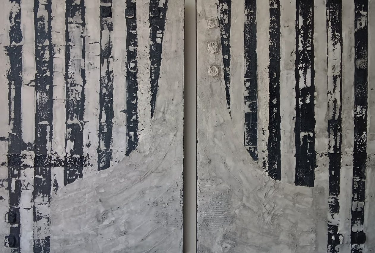 Something else is een twin, 2 maal 70 breed en 90 hoog. Lekker opgewerkt, rustige tinten : zwart en wit met een grijze waas erover heen.