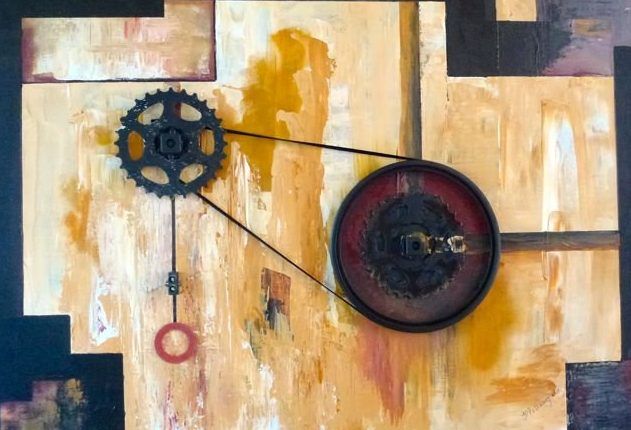 Geschilderd met acrylverf op linnen, met applicaties, o.a. fietsradertjes, div.