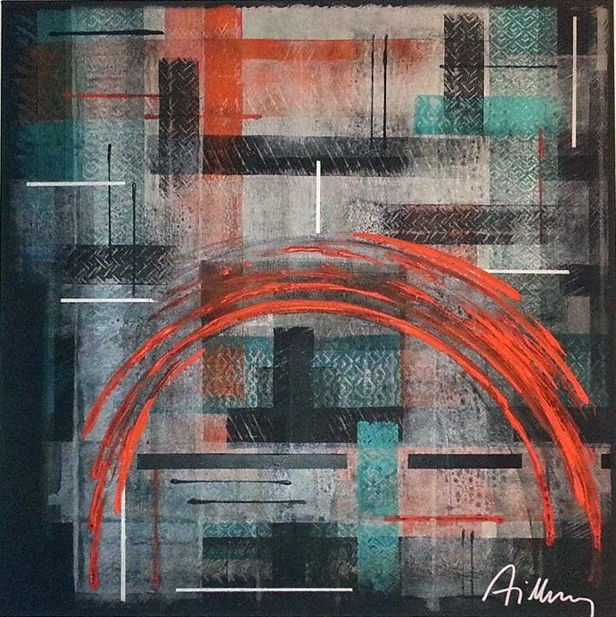 Abstract, modern, acryl, canvas, doek, orange, blauw, zwart, zilver, structuur, strak, warm, vierkant