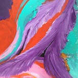 Acryl schilderij ,kleurrijk,waarin allerlei materialen verwerkt zijn.met gemengde technieken gemaakt.er us veel te zien in dit schilderij