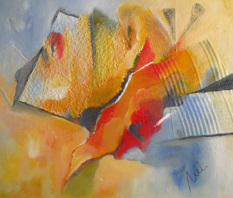 Acryl schilderij,op doek,in oranje,met andere materialen er aan toegevoegd